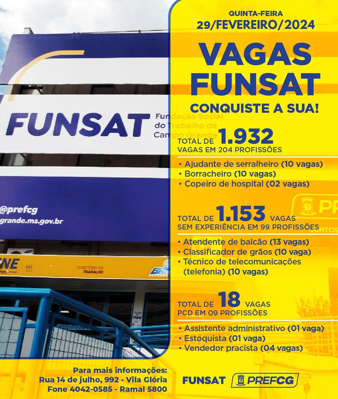 A Fundação Social do Trabalho (Funsat) oferece 1.932 vagas de emprego nesta quinta-feira (29). As contratações são para 204 profissões, em 269 empresas de Campo Grande. Conforme a Funsat, são 173 vagas para auxiliar de linha de produção, 51 vagas para repositor de mercadorias, 20 vagas para manobrista, 19 vagas para ajudante de eletricista, 11 vagas para motorista de caminhão, 10 vagas para carpinteiro, entre outras.